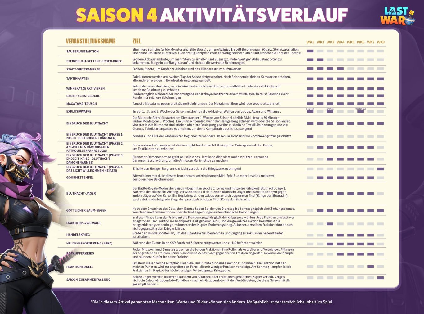 In diesem Bereich wird alles aktuell zur Season IV erklärt, ob die Buffs, neue Gebäude, die einzelnen Tag, oder Wochen. Schaut gerne ab und zu vorbei, um die neusten Informationen nicht zu verpassen. Zu Beginn werden wir uns mit der PreSeason beschäftigen, bevor wir dann auf die einzelnen Wochen eingehen werden.