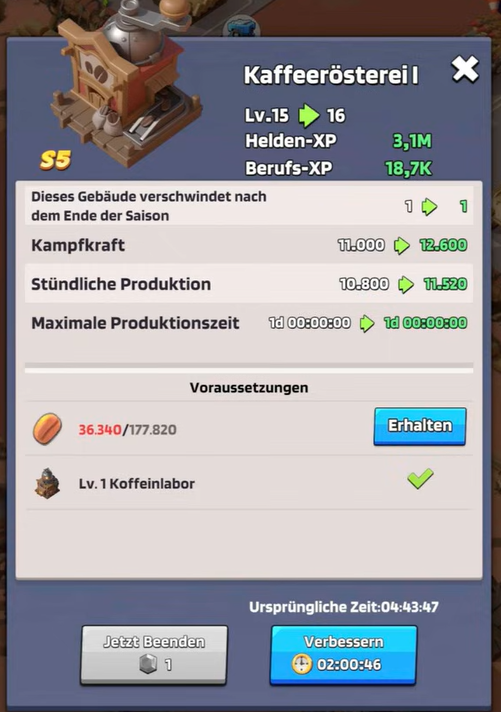 Im Anschluss verbessert Ihr die Extra Fabrik, sowie Fabrik 2 auf Level 15
